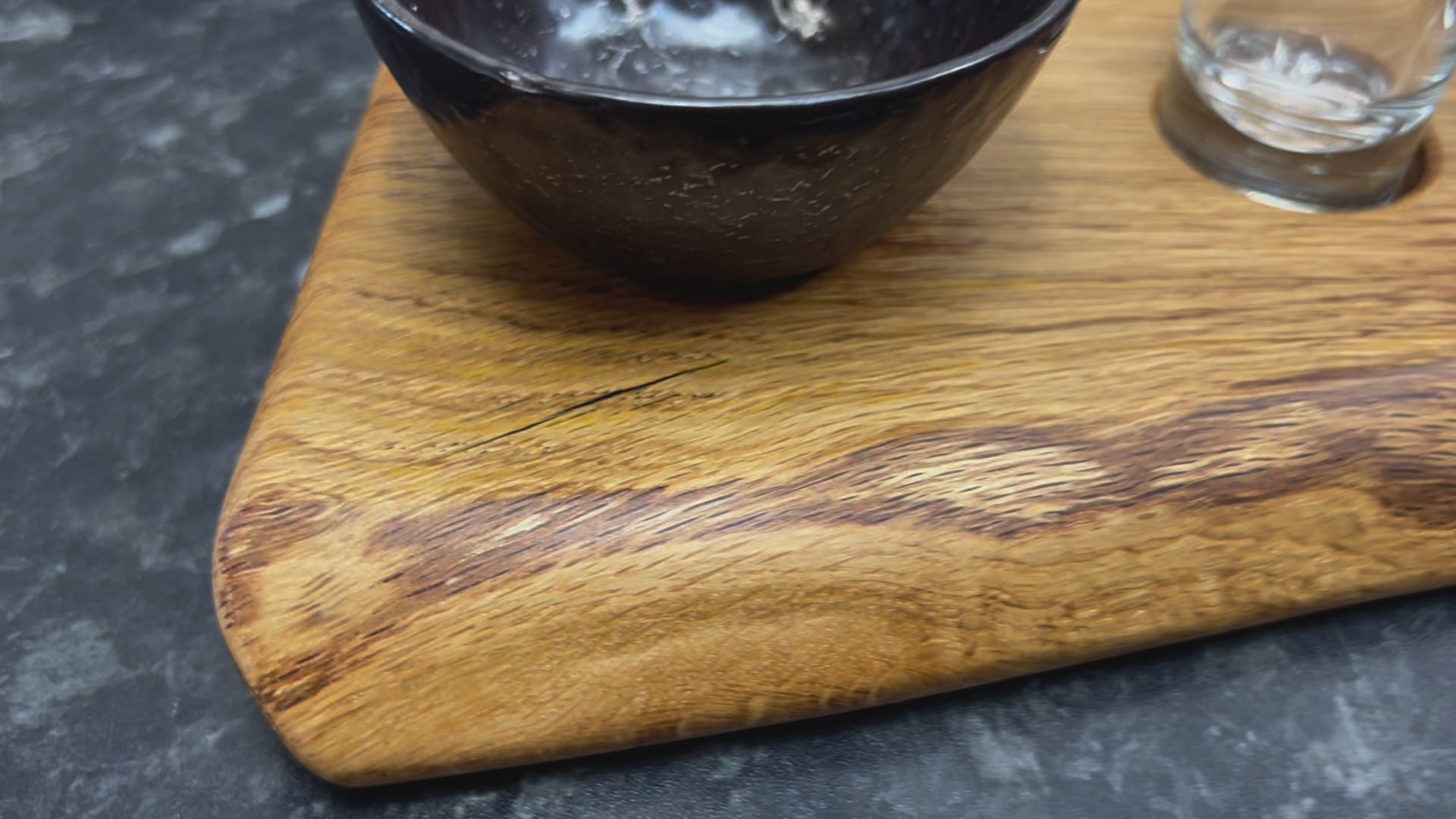 Oak tasting flight with 4 shot glasses (40ml), a salt shaker and a 9cm Rustico “Oxide” dish for limes, all embedded into the board.