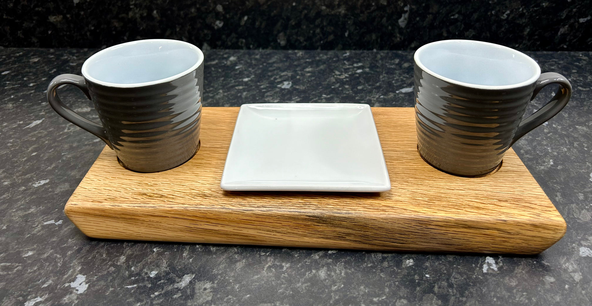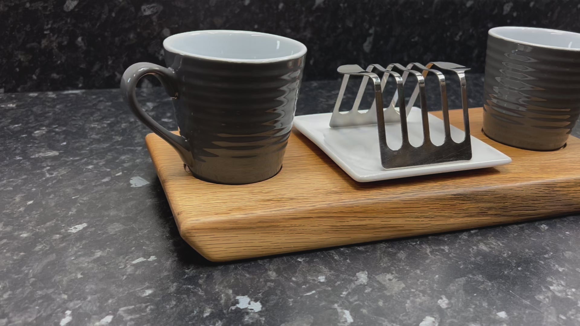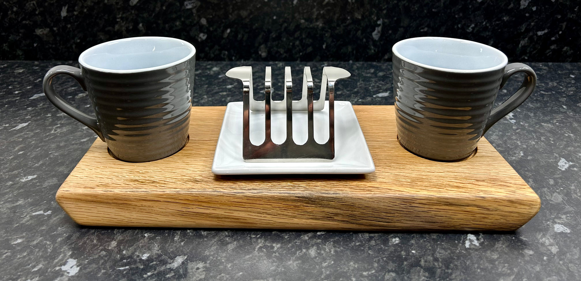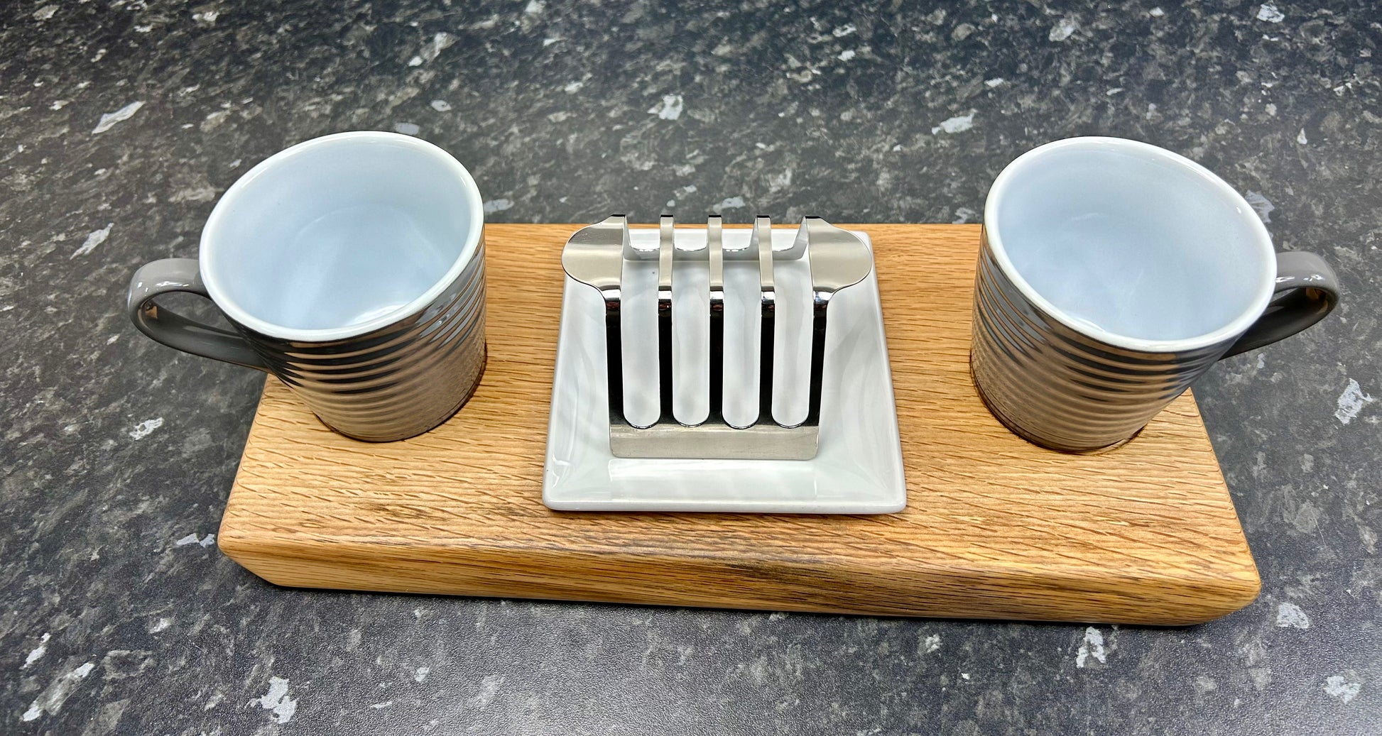 Yorkshire Oak serving board with 2 mugs, a toast rack and 14cm square plate.